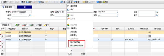 “批次自动匹配”功能是对某一行批次物品进行批次匹配;“批次整单自动匹配”则是对本单所有批次物品且批次为空的行进行匹配。