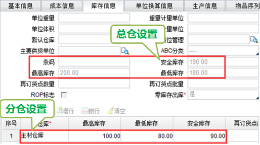 不分仓:不论单据上是否录入仓库,信息看板只显示总仓的库存数据,显示格式:最高/最低/安全库存(所有仓);