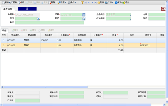仓库 | 1.由其他单据生单时,由来源单据带入。 2.手工生单时,若单头仓库非空,则带入单头仓库。 3.单行录入物品时,若单头仓库为空,且物品档案中定义了默认仓库,则带入,否则,置空。 4.可改,参照非禁用的仓库录入。 |