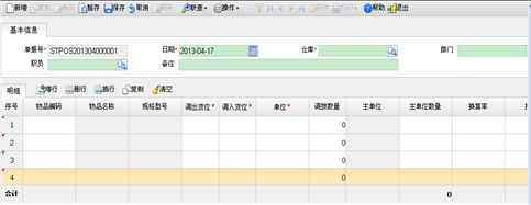以下是货位调整单的新增界面,其中有“*”标识的是必输项,保存时校验必输项不能为空。