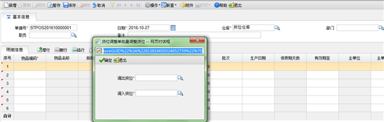 点按【确定】按钮,系统会将调出货位下的所有物品批量带入货位调整单明细行,调拨数量默认等于物品在此调出货位下的现存量。批量生成的明细行同手工新增行一样可进行修改、删行等基本操作。