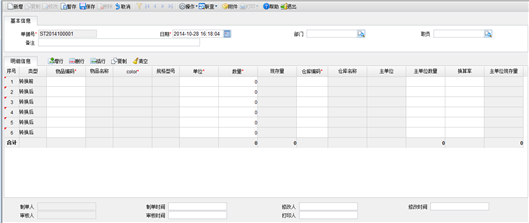 以下是形态转换单的新增界面,其中有“*”标识的是必输项,保存时校验必输项不能为空。单据通用操作参见《3.1单据》;条码录入参见《3.1.6条码录入》。