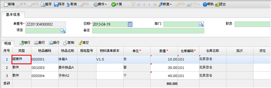 物品编码 | 组装件:手工或参照录入,只能选择物品档案中勾选“组装拆卸”的物品。 散件由相应的BOM带出子件物品,可以修改或增行删行。 |