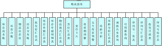 系统提供了账表的查询,主要用于查看物品出入库情况、物品结存情况、物品收发存情况、货位管理情况、批次管理情况及保质期预警等,可以按物品分类、物品名称及日期、货位、仓库等查询条件进行查询。库存管理子系统包括以下账表,如下图所示。