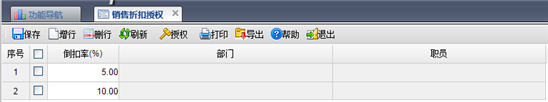 【第二步】点击〖增行〗按钮,新增一空白行,录入需要授权的倒扣率,保存。