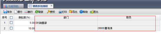 〗按钮,分配完成后,点击〖确定〗按钮,则完成授权分配,则返回到销售折扣授权列表,如下图