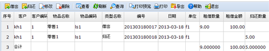 类型名称 | 如果是租借记录,则显示为租借,如果是归还记录,则显示为归还。 |