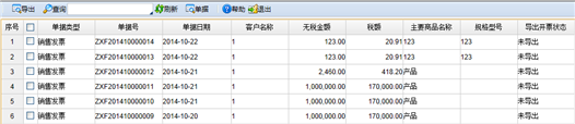 【第一步】点击“销售管理/发票/待开票销售单据列表”菜单项,进入待开票销售单据列表页面,列表中显示已审核且不存在已开票记录的单据信息。如下图所示。