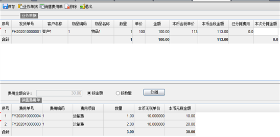 目前只支持业务单据销售发货单与销售费用单进行分摊操作。