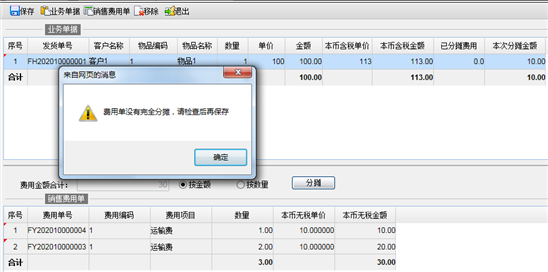 【第三步】选择按金额或按数量分摊,本次分摊金额可按发货单上数量或金额的比例自动计算分摊销售费用单的金额,也可手工修改销售发货单的本次分摊金额,本次分摊金额的合计必须等于销售费用单的总金额。如果费用单未完全分摊,不能保存,给出提示信息如下: