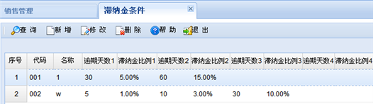 【第一步】需要先设置滞纳金条件。点击“销售管理/滞纳金/滞纳金条件”进入滞纳金条件的编辑查询界面,如下图所示: