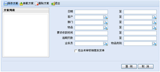 - 逾期天数:即欠款拖欠的时间,以天为单位。如果只输入一个天数,那么只查询大于该天数的单据,如果还输入了到第二个日期,那么可以查询从第一个天数到第二个天数范围内的单据。