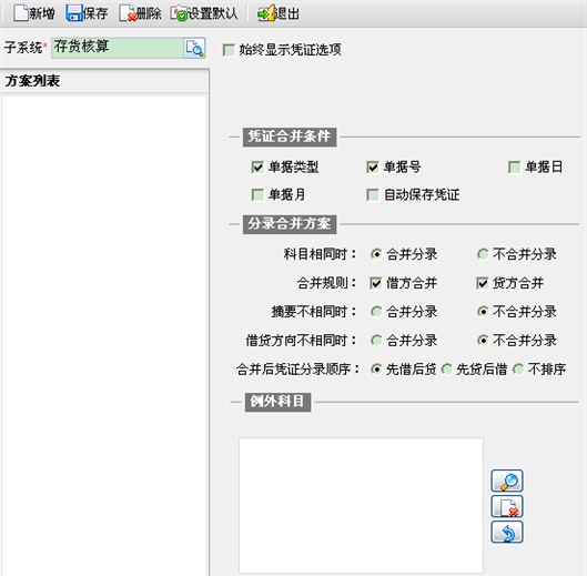 - 分录合并方案:对于需要合并的凭证,由于原凭证的分录已定,合并的凭证中可能有多个相同的科目,故而借此设置合并时是否合并分录,按何种方式、在何种条件下合并分录。