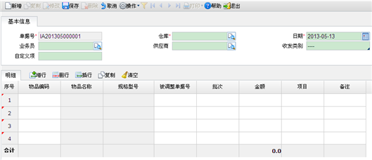 以下是入库调整单的新增页面,其中有“*”标识的是必输项,保存时校验必输项不能为空。单据通用操作参见《库存管理》用户手册 第三章 通用操作3.1单据。
