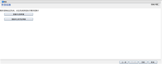 【第二步】选择检查项后,点击“下一步”按钮,系统会自动进行结账相关检查,如果检查不通过,则不能进行结账,如果检查通过,则可以点‘完成’按钮进行结账。如下图所示。