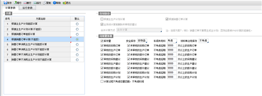 用户可以设置的参数有两类,一类是运行参数,用于控制MRP计算的过程,另一类是计算参数,用于影响MRP计算的结果。用户可以针对计算参数设置不同的方案,但只能设置一套运行参数。
