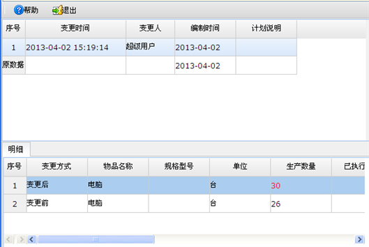 对生产计划进行变更过,可以点击操作下“变更记录”按钮,来查看具体的变更内容。如下图所示。