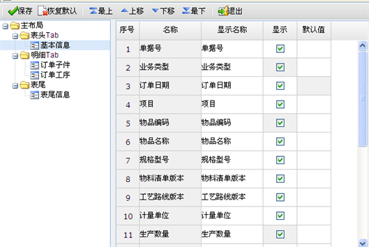 4 并用鼠标单击【上移】、【下移】、【最上】、【最下】按钮,调整此项目在单据中显示的位置。