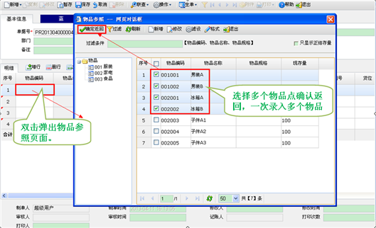 在单据明细页面,双击物品编码域,弹出物品参照页面,选择多个物品,点“确定返回”,选择的物品即可带入单据明细页面,达到快速录入物品的目的。