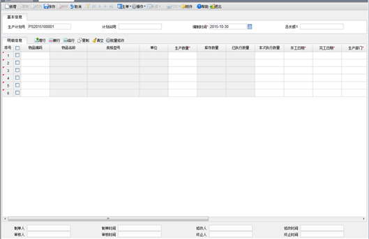 【第一步】点击“生产制造/生产执行/生产计划/生产计划”菜单项,进入生产计划录入页面。注意带红色*号的为必录项。如下图所示。