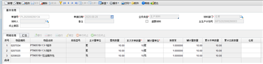 在明细页签下录入子件信息,如:需用数量、可领数量、本次开单数量、输入后还可以查看到累计开单数量、累计出库数量、车间余料等信息。