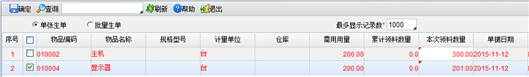 在拉单界面中,如果本次领料数量加累计领料数量大于需用数量,该行就用红色显示,用户可以修改。如下图所示: