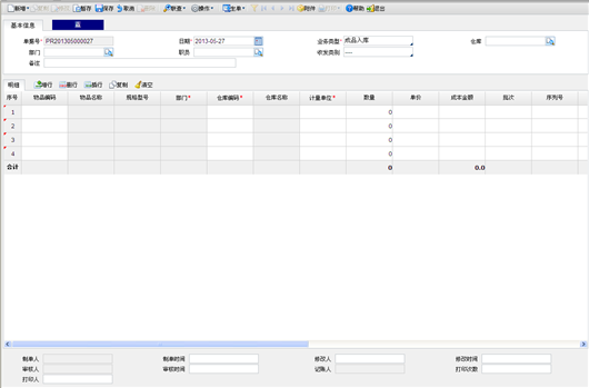 【第一步】在库存管理系统,点击“入库/成品入库”菜单项,进入成品入库填制页面。如下图所示。
