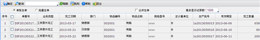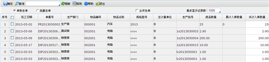 【第二步】输入相应的查询条件,点击“确定”按钮,进入生产完工生成成品入库单选单页面,如下图所示。在此页面可以选择单张,还可以选择多张合并或批量生成成品入库单。