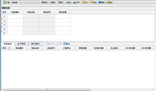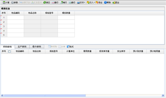 通过缺料模拟可以模拟计算当前要生产一定数量的产品,其原材料或零部件够不够,缺多少,以便安排相应的生产、采购和委外。此功能类似于一个小的MRP计算,但要比MRP计算考虑得简单,如果需要更多的功能、考虑更多影响因素可以使用生产计划系统来处理。