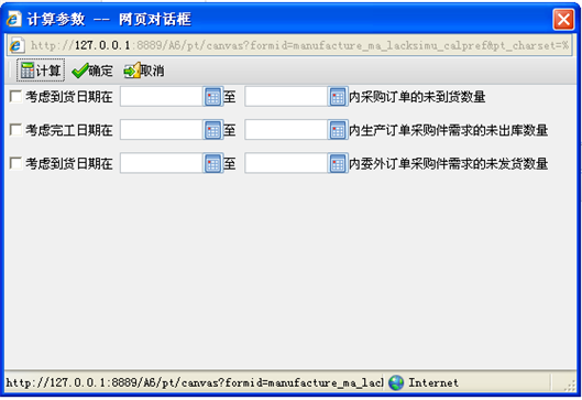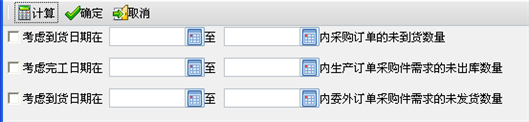 考虑完工日期在某个范围内的生产订单的采购件需求的未出库数量 | 只有选择了才有效。将考虑指定完工日期范围内采购件需求(子件为采购件)的未进行材料出库的数量。 |