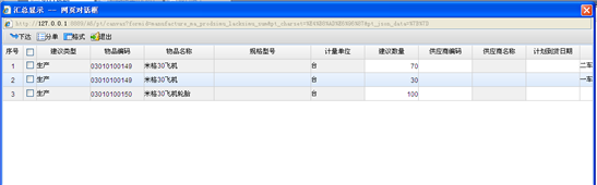 5.汇总显示:如果计算结果想在一个界面中显示,不分三个页签分别显示,可以点击汇总显示进入汇总页面,在汇总页面中也可以分单和完成下达动作。如下图: