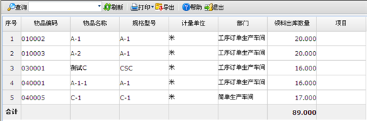 主要功能:用以查询一段时间内生产部门领料出库的汇总信息。