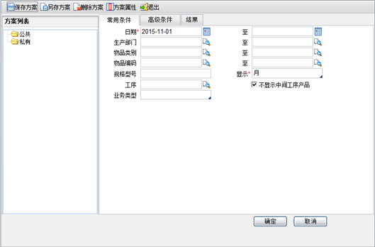 【第一步】点击“生产执行/账表/生产综合统计分析”菜单项,进入生产综合统计分析查询条件设置界面,其中有“*”标识的是必输项。如下图所示。