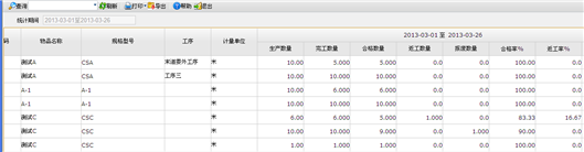 【第二步】查询条件设置完毕,点击“确定”按钮,进入生产综合统计分析显示页面,如下图所示。