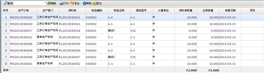 主要功能:用来查询生产订单的领料单情况和领料单出库的明细情况,在生产流程里有领料单的情况下使用该查询。