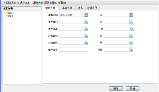 【第一步】点击“生产执行/账表/生产订单材料出库明细”菜单项,进入生产订单材料出库明细表查询条件设置页面,如下图所示。