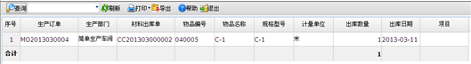 主要功能:本功能用来查询生产订单对应的的材料出库明细情况,在生产领料流程中使用生产订单-材料出库单时使用该查询。