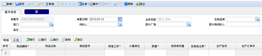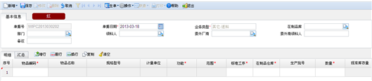 以下是在制品出库红单界面。其中有“*”标识的是必输项,保存时校验必输项不能为空。