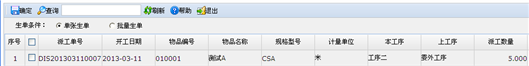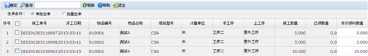 【第一步】在在制品出库新增页面,点击“生单/派工单”菜单项,进入派工单生成在制品出库界面。如下图所示,在此页面可以选择单张,还可以选择多张批量生成在制品出库。
