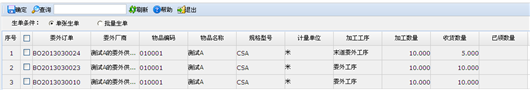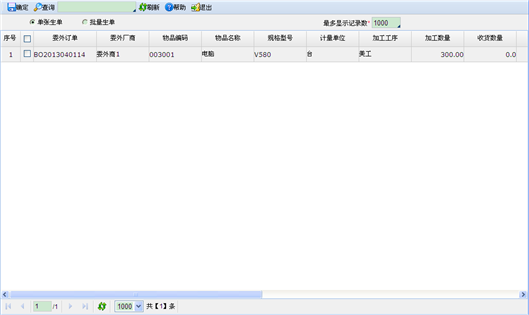 【第一步】点击“生单/工序委外订单”,进入工序委外订单查询界面。如下图所示。