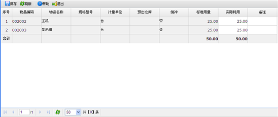 如果当前行为订单派工、无工序领料工序派工末序或有工序领料的工序完工汇报时,点击“材料耗用”后,会弹出材料耗用界面。如下图所示。