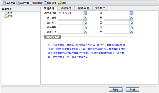 该功能用于收集车间派工单的完工信息。主要收集车间完工数量、合格数量、返工数量、报废数量、作业时间及材料耗用信息。