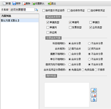 3. 对所选的方案,设置凭证合并条件、分录合并方案和例外科目。