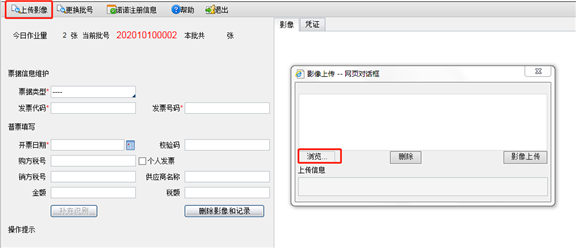 2. 在影像上传采集页面,点击〖上传影像〗按键,点弹出框选择发票图像文件后,上传。