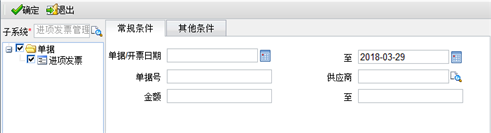 - 单据/进项发票:与上方子系统有关。查询前,请勾选进项发票,即查询的单据范围为进项发票。