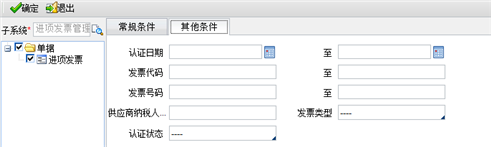 按以上菜单路径进入进项发票生成凭证页面时,系统自动弹出查询条件页面。也可通过点击上方功能按钮行中的〖查询〗进入。查询条件页面有两个页签。两个页签的查询条件可同时使用,即查询时常规条件和其他条件两个页签的条件,均作为查询依据使用。根据实际情况设置查询条件即可。