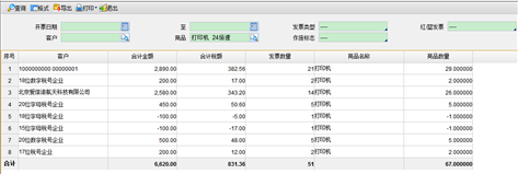 - 商品数量:按查询条件中,结果页面汇总条件所查询出的该条记录的商品数量。商品数量取自符合条件的各个销项发票。