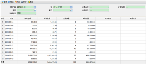 按周:日期列显示开票期间内期间的各周第一日的记录,且所在的记录行统计的是一周的记录。