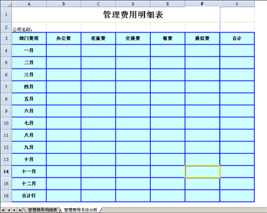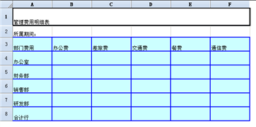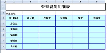 在组合单元格A1:F1处输入“管理费用明细表”;在A2单元格录入“所属期间:”;在A3单元格录入“部门费用”,在B3、C3、D3、E3、F3单元格处分别输入“办公费”、“差旅费”、“交通费”、“餐费”、“通信费”;在A4、A5、A6、A7、A8单元格处分别输入“办公室”、“财务部”、“销售部”、“研发部”、“合计行”。录入完成后表格显示如下图所示: