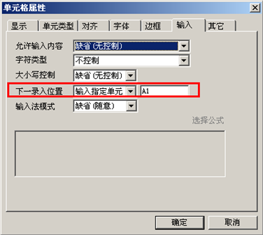 - 若在“格式/单元格/输入/下一录入位置”进行了设置,例如选择某一单元格,设定下一录入位置为“输入指定单元”“A1”,则录入完成此单元格后,点击Enter回车键,则自动回到A1单元格。下一录入位置设置页面如下图所示: